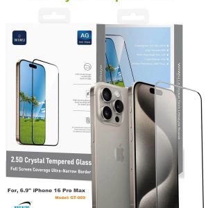 WiWU 6.9″ iPhone Tempered Glass Screen Protector/2.5D Crystal Tempered Glass (Full Screen Coverage Ultra-Narrow Border), Model: Wi-GT009, Designed for Apple iPhone 16 Pro Max (Clear/Transparent)