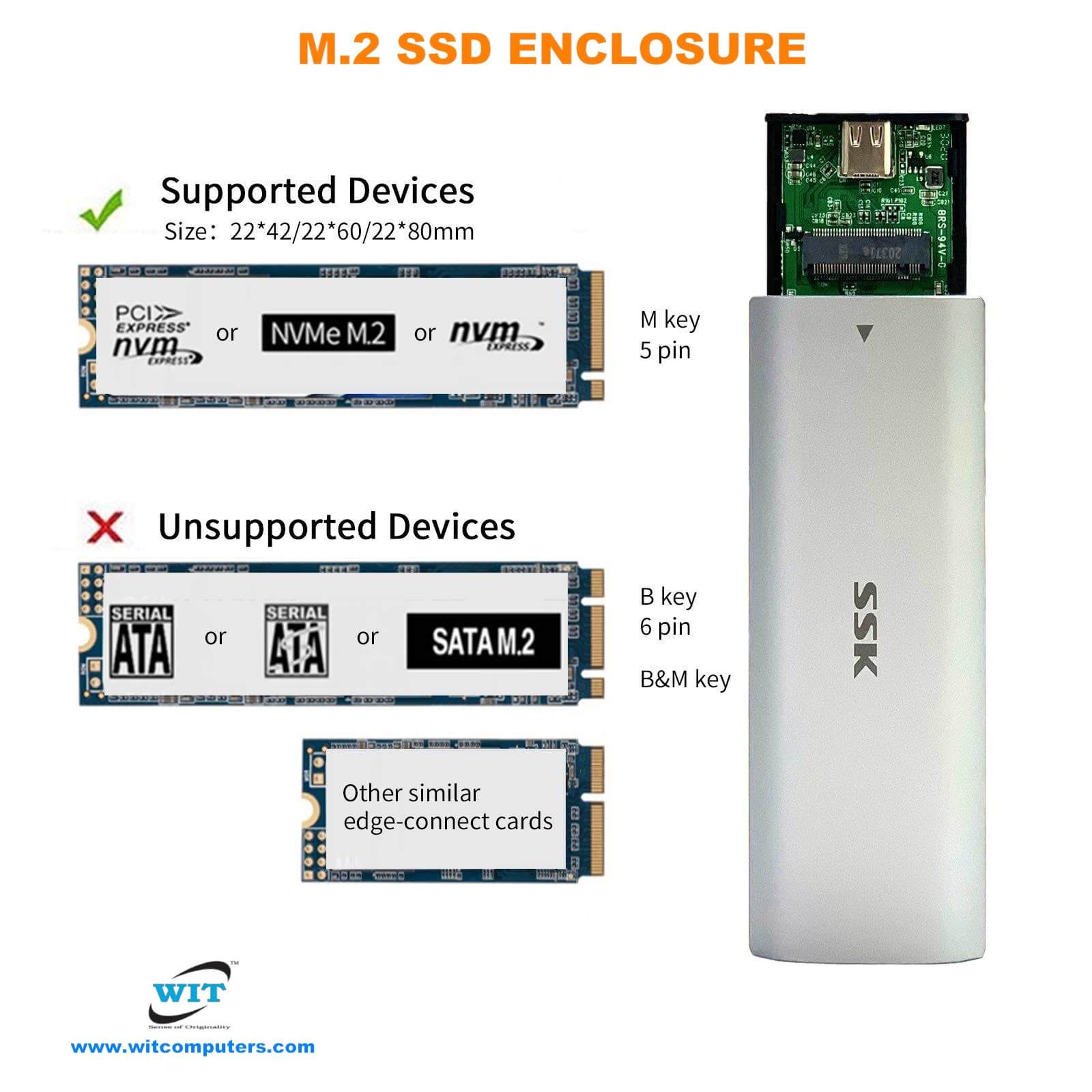 - Applicable SSD: SSK M.2 NVME SSD Enclosure is compatible with NVME PCIe M Key connectors SSD.